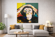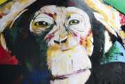 動物シリーズの作品の1点で、猿の可愛らしさと共に存在感や力強さを感じる作品。大きな正方形キャンバスに描かれていて迫力があります。