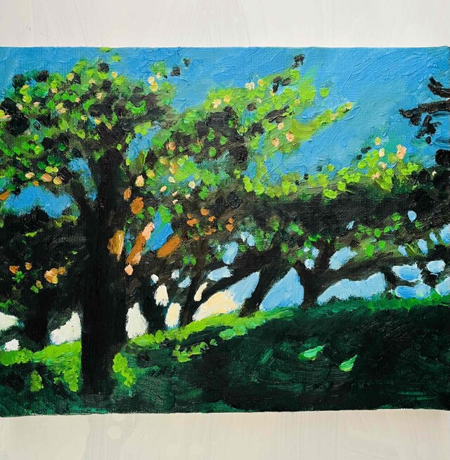 油彩画 原画「近所の風景 堤防」アート 絵画 22×27㎝ F3