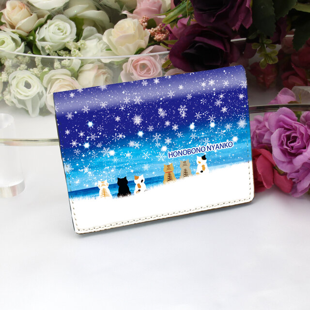 ほのぼのにゃんこシリーズ雪花バージョン。定期や名刺などのカードも収納できるカードケースです。