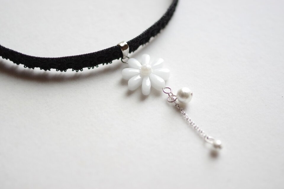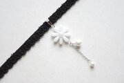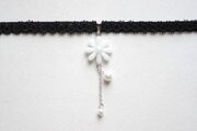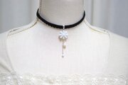 中心の花芯とコットンパールの光沢のある輝きが上品なチョーカー。