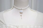 淡い淡い、どこまでも仄かでほとんど白と区別がつかないようなレジンの水色のお花を、サテンリボンにタティングレースで装飾を施したチョーカーに仕上げました。