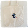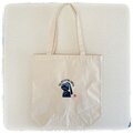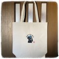 このトートバッグは、名画「真珠の耳飾りの少女」をユーモラスにアレンジしたカエルのユニークなデザインが魅力です。厚みのあるコットン生地に、青いターバンが鮮やかに刺繍され耳にはパールイヤリングがついて、まるでアート作品を持ち歩いているかのような特別な一品です。