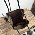 コンパクトな縦長に、ニコッと笑ったような口のレザーポケットの巾着バッグ。