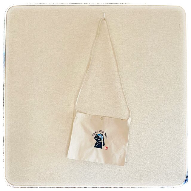 このサコッシュは、名画「真珠の耳飾りの少女」をユーモラスにアレンジしたカエルのユニークなデザインが魅力です。厚みのあるコットン生地に、青いターバンが鮮やかに刺繍され耳にはパールイヤリングがついて、まるでアート作品を持ち歩いているかのような特別な一品です。