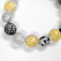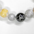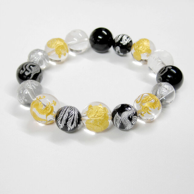 中国の神話における四方を守る霊獣の朱雀と玄武、青龍、それに財神とされるヒキュウ、縁起物の招き猫や幸運の象徴とされる四つ葉のクローバーが彫られた本水晶とオニキスのブレスレットです。透き通る透明感の本水晶と、光沢感の綺麗なオニキスを使っています。