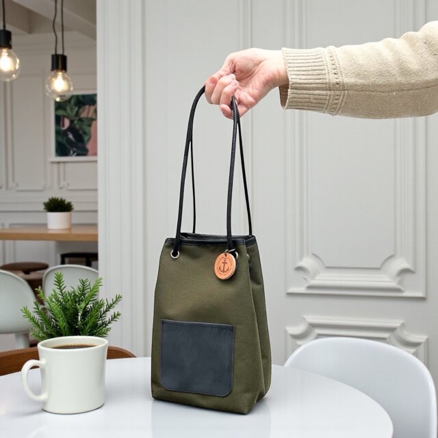nico:カーキ×ブラック(撥水加工ナイロン素材×イタリアンレザー巾着バッグ)受注製作