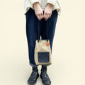 コンパクトな縦長に、ニコッと笑ったような口のレザーポケットの巾着バッグ。