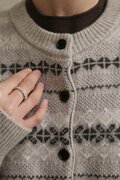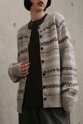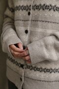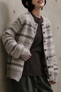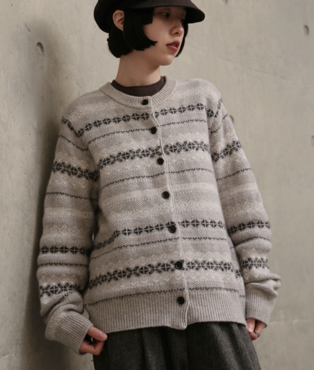 ほっこりとした優しい印象を纏える、フェアイルーニットのカーディガンです。淡いグレーを基調に、温かみのある北欧風のジャカード模様が、冬の装いに心地よい彩りとアクセントを添えます。ゆったりとしたシルエットが体を包み込み、どんなスタイルにも溶け込む親しみやすさが魅力です。