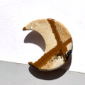 ベージュからクリーム色を基調に、黄褐色の帯状模様がくっきりと走る月形ルースです。