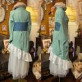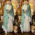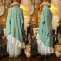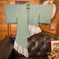 【単衣 色無地 着物 2way アシンメトリー ガウン 羽織り ドレス ワンピース ハンドメイド 和洋折衷 洗える 化繊 リメイク 名古屋帯サッシュベルト レトロ 古着 若草の調べと純白レースの華やぎ KD-91】