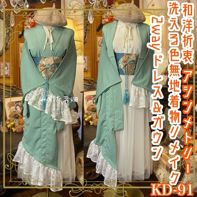 単衣 色無地 着物 2way アシンメトリー ガウン 羽織り ドレス ワンピース 和洋折衷 洗える 化繊 リメイク KD-91