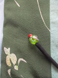 中綿を入れ、正絹の黒の着物で作ったループをつけ、ループの先に、トンボ玉と山サンゴを付けています。