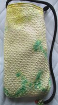 袋の口の片側に、ループの輪をつけ、中にループの端を通して結ぶようにしてバックや腰に下げるようにしています。