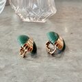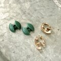 ジェイドのようなモスグリーンのアクリルと、ゴールドトーンが合わさるコンバーチブルイヤリング。取り外し可能で、ゴールドトーンの縦長のイヤリングとしてもお楽しみいただけます。