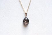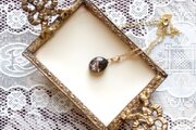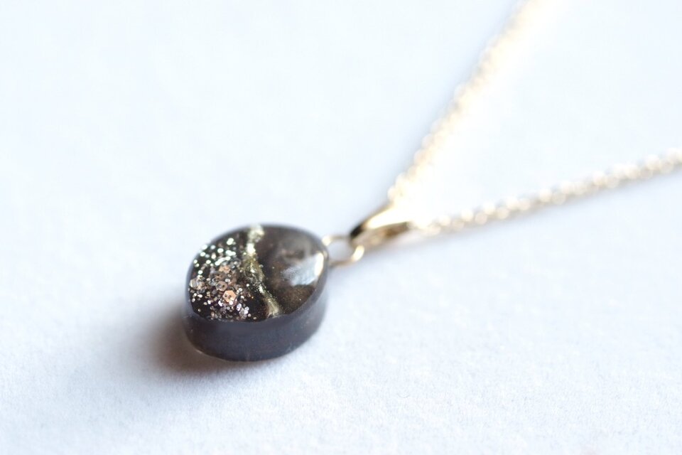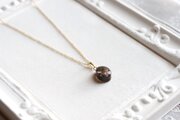 落ち着いたダークブラウンのマーキス型のレジンにゴールドの装飾を施したペンダント。