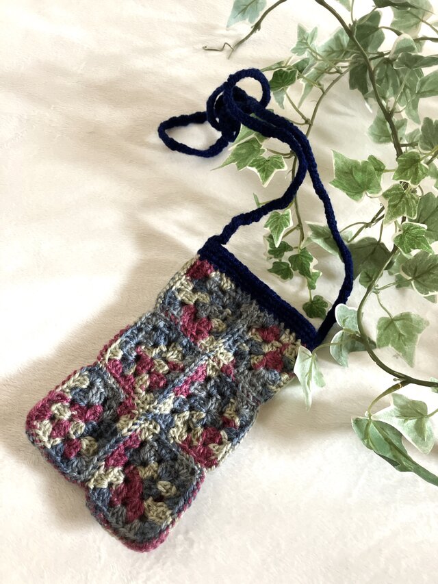 パーツを編み合わせたモチーフサコッシュです!スマホを入れるサイズにしました。縦16.5/横10/紐105