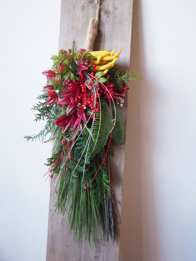 フレッシュ(仏手柑・大王松・ヒノキ・南天・オタフク南天・シダ・柳)・ドライ(ナンキンハゼの実・黒米)