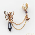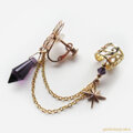 蝶々と紫色の雫型ビーズが揺れるネジバネ式イヤリングとビーズと星モチーフが揺れるイヤーカフを2本のチェーンで繋げました