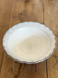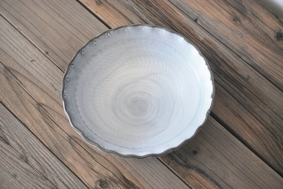 飛び鉋(とびかんな)の技法で見込みに模様を施し、白い釉薬をかけて焼成しました。