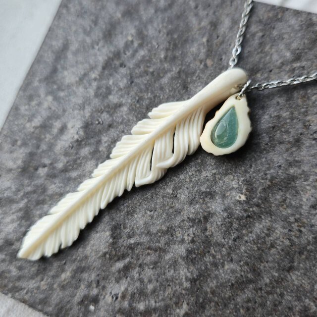 こちらは【鹿の角 グランディディエライトと風切りフェザーのネックレス】になります。