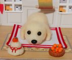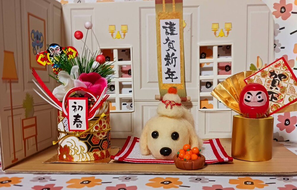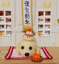 新年を祝う犬のフェルト鏡餅と樹脂ミカン3セット。