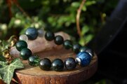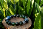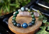 14ミリのブルーカイヤナイトAAA級、眩いほどの輝きです。霊的な石、様々な事柄がクリアに見れるようになります。12ミリのダークブルーアイオライトAA級、感性を研ぎ澄ますビジョンの石、精神を安定させてくれます。ナチュラルレアエピドートAAA級12ミリ、過去からの解放を暗示し、意識を変革してくれる石です。12ミリのAAA級グリーンファントム、精神を落ち着かせ、癒し、能力を引き出してくれる力があります。AAA級の美しいラブラドライト、想像力、直感力を高め、インスピレーションを与えます。宇宙からのメッセージを持ち主に届ける石です。最後に光沢の美しい大玉15ミリのクリソベリルキャッツアイ、真実を危険を予知し、霊力を高めるとされています。