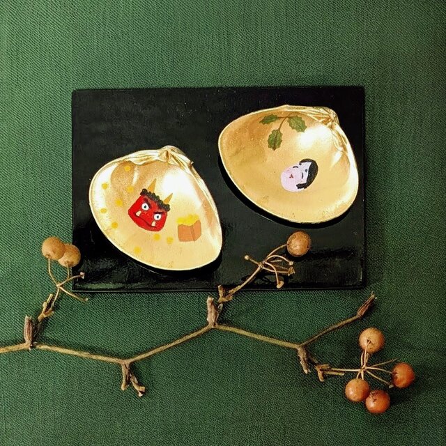 ハマグリの貝殻にアクリル絵の具でお多福と鬼を描いた、節分の貝合わせです。