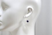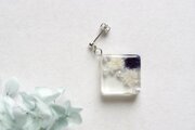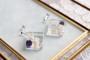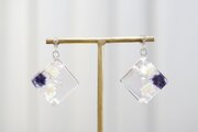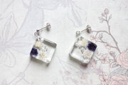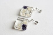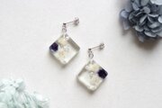 四角いレジンにコバルトブルーとオフホワイトのお花、パール、ブリオンを沈めたピアス。