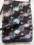 中綿を入れ、男絣の着物で作ったループをつけ、ループの先に、トンボ玉と山サンゴを付けています。