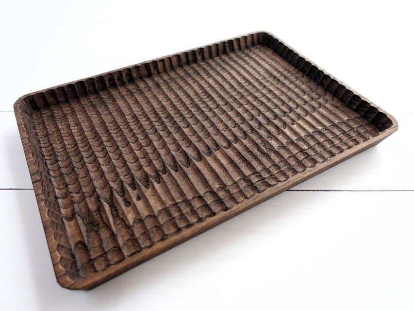 力強い彫りなのに、思いのほか手触りは優しく、また裏面もリバーシブルで使えるという発見もあり、いい買い物をさせていただきました。奇しくも新潟のへぎそばを送って頂いたのと重なり、へぎそばのへぎってこのことだったんだと合点した次第です。大事に使わせていただきます。有難うございました。