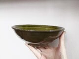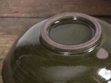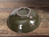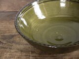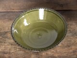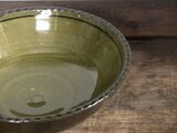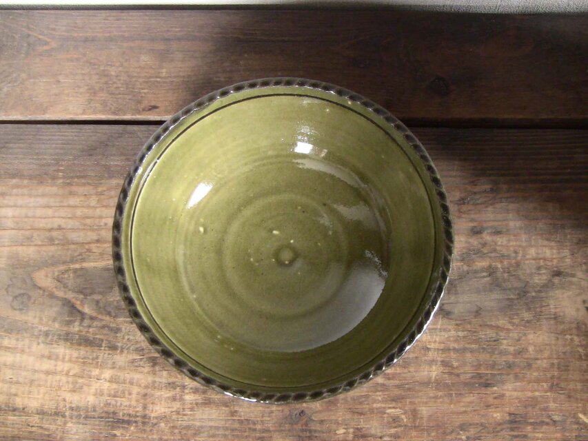 素地に化粧泥を掛けから飾り縁を施しオリーブ釉を施釉して焼成しています。
