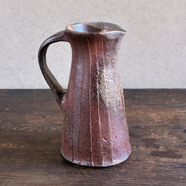 縦の線文を刻み込んだ、把手付きの花入。