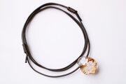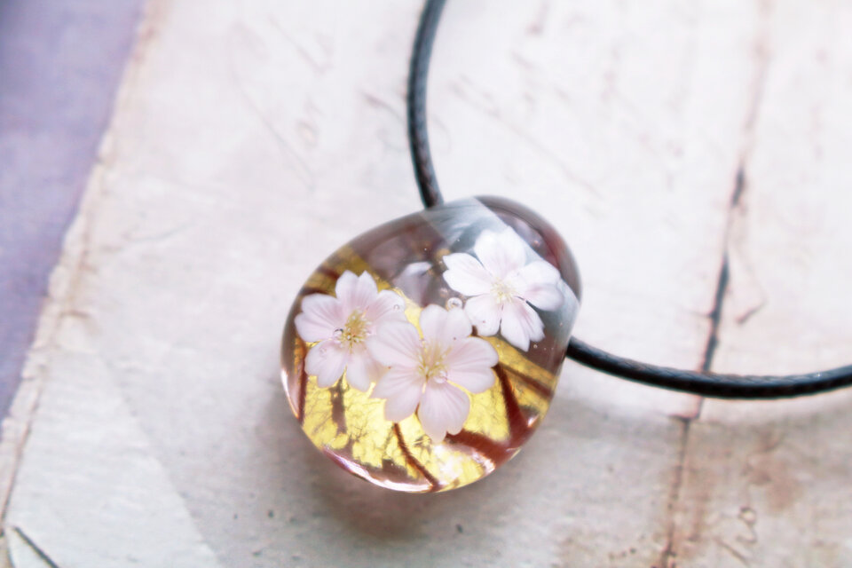 金箔を入れた薄いピンクの地に、桜を咲かせたガラスペンダントです。