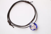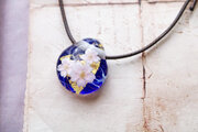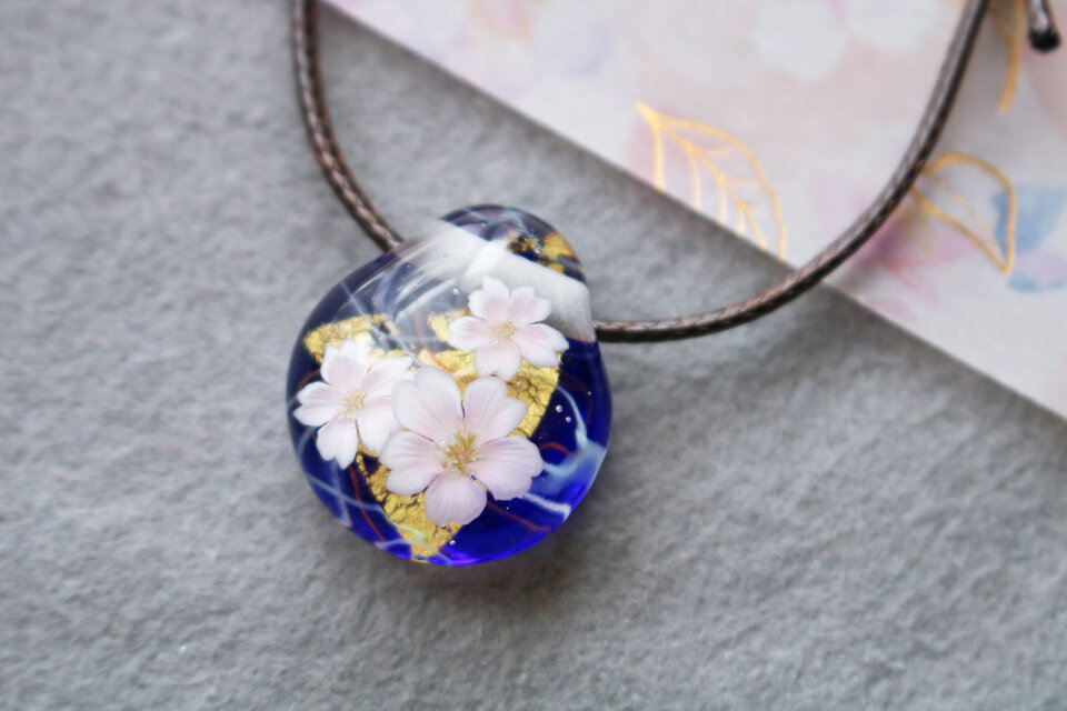 金箔を入れた青色の地に、桜を咲かせたガラスペンダントです。