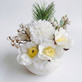 和の雰囲気のある丸い花器に白い寒椿と菊、