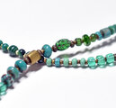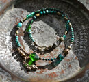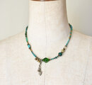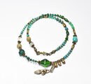 グリーンボヘミアビーズとアフガンパーツ&民族鈴、クリアビーズ、つぶつぶブラス、多彩グリーンビーズ、ターコイズ&クリソコラ&マラカイトなどを繋いだネックレスです。