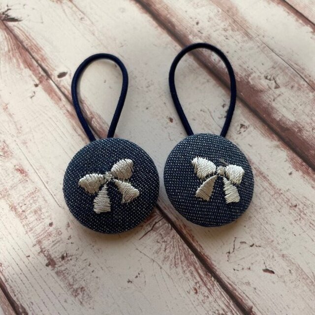 くるみボタン ヘアゴム リボン刺繍 ②ソフトデニムブルー 27mm 2個セット