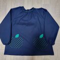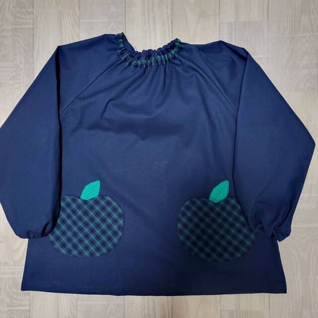 【80~160】りんごポケット グリーン チェック ネイビー 長袖スモック 首パイピング 着丈延長可
