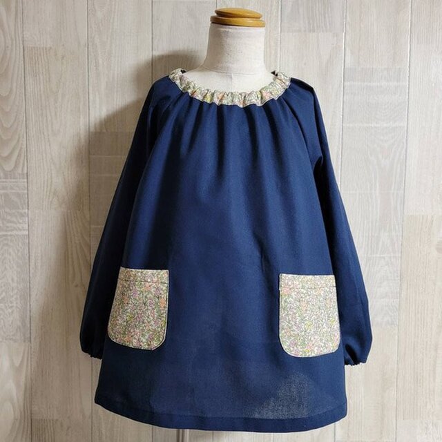 【80〜160】 リバティA ③ピンク ラセンビィコットン ネイビー 長袖スモック 首パイピング