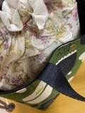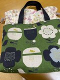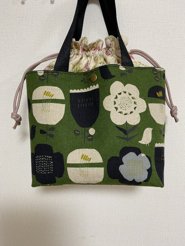落ち着いた深みのあるグリーンのトートバッグに可愛い花柄の巾着であおり巾着バッグに仕立てました。