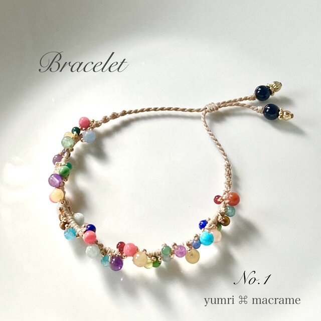 3サイズの小粒天然石とビーズを可憐に編み込んだマクラメブレスレットです。端にはアクセントに大粒天然石を付けました✩.*˚
