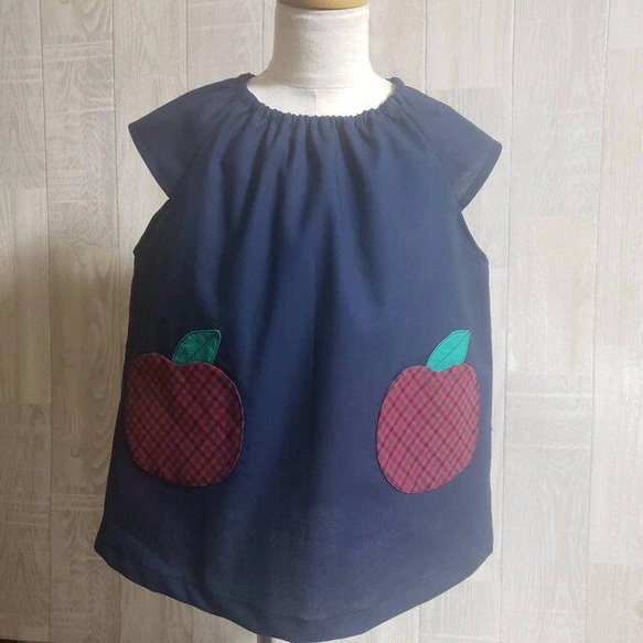 【80~160】りんごポケット レッド チェック ネイビー 半袖スモック ショート袖 着丈延長可