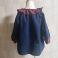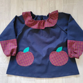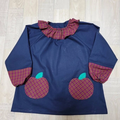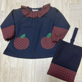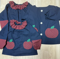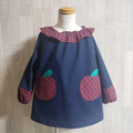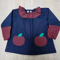 【80~160】りんごポケット レッド チェック ネイビー フリル襟 長袖スモック 袖口切替あり 着丈延長可