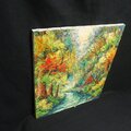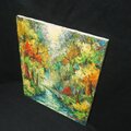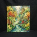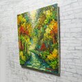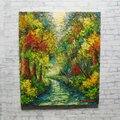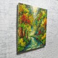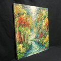 本作品では、ホルベインの油絵具を使用した鮮やかな色彩が特徴で、深い緑を基調に赤、黄、オレンジといった暖色系の色がアクセントとして散りばめられ、季節の移ろいや光の当たり具合を強調しています。画面上部から差し込む柔らかな光が、森の奥に続く小川の道筋を照らし出し、鑑賞者を絵画の世界へと深く引き込みます。そのまどろみの中で、自然の生命力とエネルギーが感じられる、印象派を思わせる表現が際立っています。