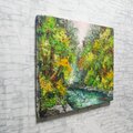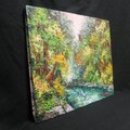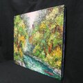 本作品では、ホルベインの油絵具を使用し、色彩の変化や質感の表現に注力しています。木々の葉に混じる黄緑色、黄色、赤みを帯びた色合いが、季節の移ろいと光の差し込み方を巧みに引き立てており、深い森の奥行きを鮮やかに描写しています。立体感のある絵の具の塗り重ねが、木々の幹や水面のきらめきを表現し、見る人の心を豊かにします。