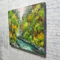 「新緑の渓流」は、自然のエネルギーを余すところなく表現した特別な油絵です。縦455mm、横530mmのサイズは、広がる緑の風景を背景に心を和ませ、観る人を自然の中へといざないます。鮮やかな新緑と水色の川の美しいコントラストが際立ち、まるで実際に渓流のほとりにいるかのような臨場感をもたらします。