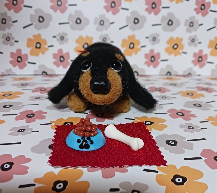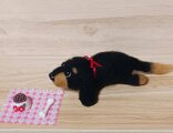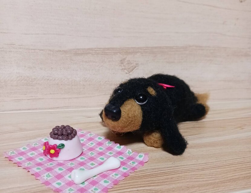 羊毛フェルト製の黒い犬、赤いリボン付き。