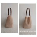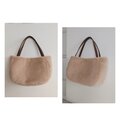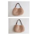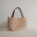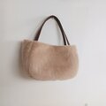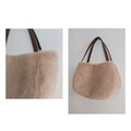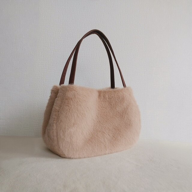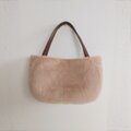 秋冬にぴったりなモカベージュの毛足10mmの毛先がシャギーっぽくなった、柔らかい肌触りのラビットボア(エコファー、フェイクファー、ソフトファー)を使用した、ぷっくりした形が可愛い2通りの形で楽しめ、持ち手はは焦げ茶の帆布で長めなのでダウンなどの厚みのあるコートを着用しても肩掛け出来るバッグに仕上げました。