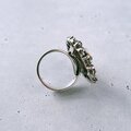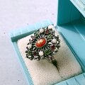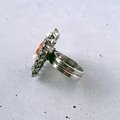 1911年にアメリカのロードアイランド州プロビデンスにて創業し、100年以上の歴史を持つジュエリーメーカーUncas Manufacturing Company(アンカス)の黒ずみ加工が施されたオープンワークのシルバーメタルのハートに樹脂製のカメオ、フェイクパール、レッドとライムグリーンのラインストーンがあしらわれたヴィンテージリングです。