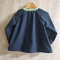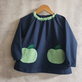 【*80~160】りんごポケット グリーン ギンガムチェック ネイビー 長袖スモック 首パイピング 着丈延長可